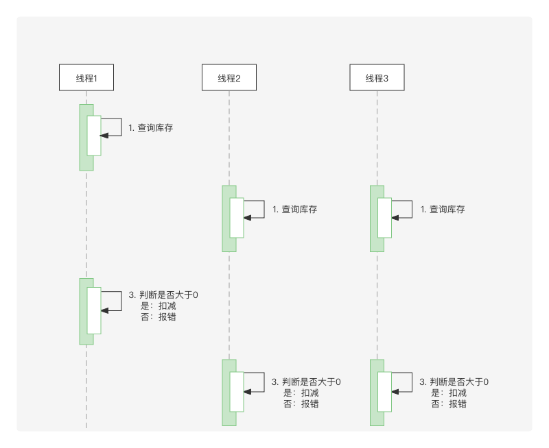 假设当券剩下最后一张时,有三个线程(用户)同时抢购,线程1先查询结果有1个,这时线程2和3在1扣减之前先查询了结果也是1,此时线程1先去执行扣减操作,这是数据库中券为0。由于线程2和3查询也是1,所以也去扣减,超卖问题出现了。