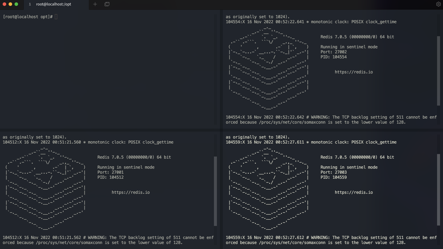 redis-sentinel s1/sentinel.conf redis-sentinel s2/sentinel.conf redis-sentinel s3/sentinel.conf