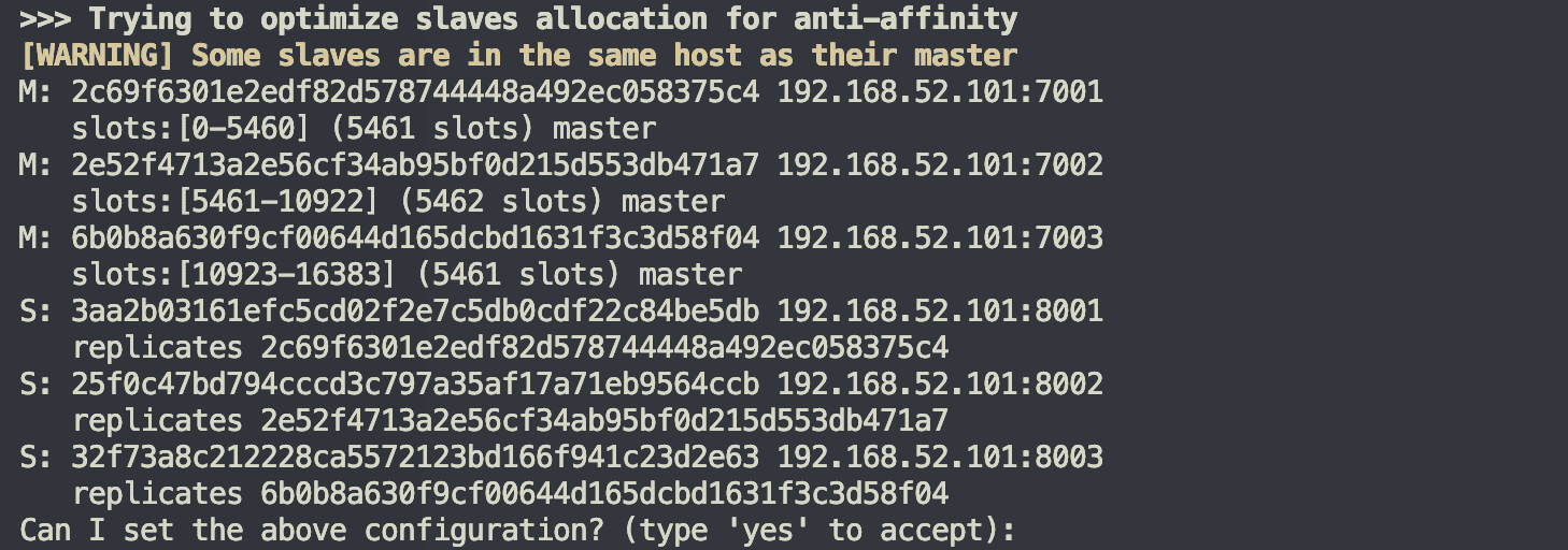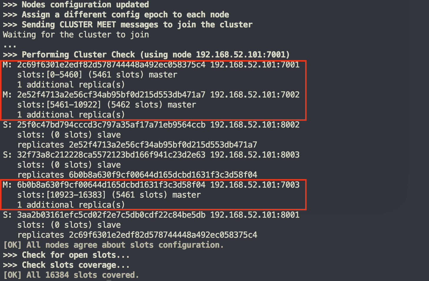redis-cli --cluster create --cluster-replicas 1 192.168.52.101:7001 192.168.52.101:7002 192.168.52.101:7003 192.168.52.101:8001 192.168.52.101:8002 192.168.52.101:8003