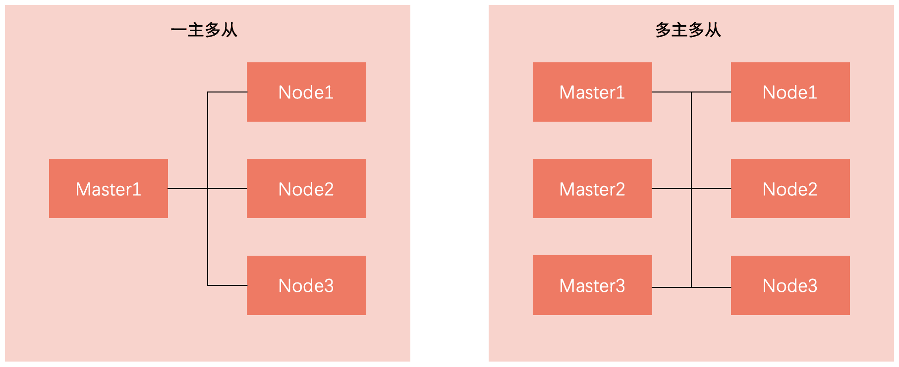 一主多从 :一台Master节点和多台Node节点,搭建简单,但是有单机故障风险,适合用于测试环境