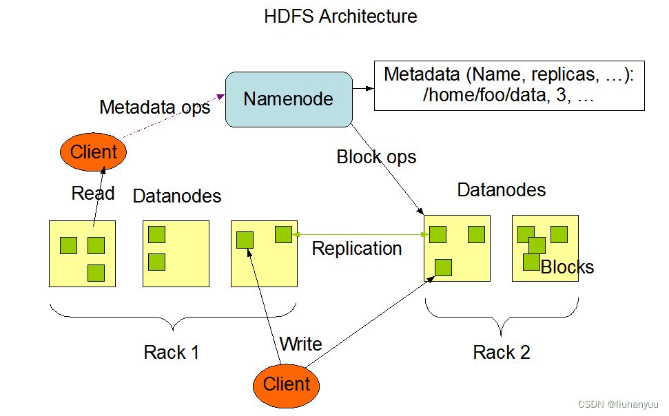 HDFS遵循主从架构(master/slave)。通常包括一个主节点和多个从节点。主节点为NameNode,从节点为DataNode。