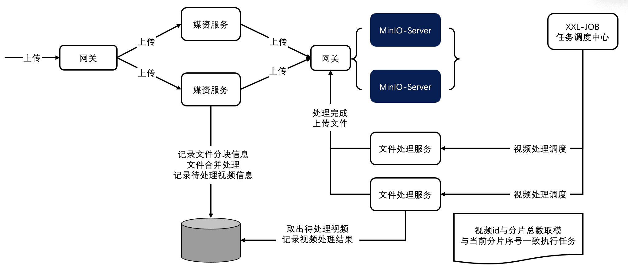 VideoTask @Slf4j @Component public class VideoTask { private final MediaProcessService mediaProcessService; private final FileStorageService fileStorageService; private final MediaProcessSaveService mediaProcessSaveService; public VideoTask (MediaProcessService mediaProcessService, FileStorageService fileStorageService, MediaProcessSaveService mediaProcessSaveService) { this .mediaProcessService = mediaProcessService; this .fileStorageService = fileStorageService; this .mediaProcessSaveService = mediaProcessSaveService; } @XxlJob("videoJobHandler") public void videoJobHandler () throws Exception { int shardIndex = XxlJobHelper.getShardIndex(); int shardTotal = XxlJobHelper.getShardTotal(); int processors = Runtime.getRuntime().availableProcessors(); List<MediaProcess> mediaProcessList = mediaProcessService.getMediaProcessList(shardIndex, shardTotal, processors); int size = mediaProcessList.size(); if (size == 0 ) { log.debug("取到的视频处理任务数:{}" , size); return ; } ExecutorService executorService = Executors.newFixedThreadPool(size); CountDownLatch countDownLatch = new CountDownLatch (size); for (MediaProcess mediaProcess : mediaProcessList) { executorService.execute(() -> { try { Long taskId = mediaProcess.getId(); boolean lock = mediaProcessService.startTask(taskId); String fileId = mediaProcess.getFileId(); if (!lock) { log.debug("抢占任务失败,任务id: {}" , taskId); return ; } String bucket = mediaProcess.getBucket(); String objectName = mediaProcess.getFilePath(); File file = fileStorageService.downloadFile(bucket, objectName); if (file == null ) { log.error("下载视频出错,任务id: {}, bucket: {}, objectName: {}" , taskId, bucket, objectName); mediaProcessSaveService.saveProcessFinishStatus(taskId, ProcessStatus.PROCESS_FAIL.status(), fileId, null , "下载视频到本地失败" ); return ; } File sourcePath = file.getAbsoluteFile(); File targetFile = null ; try { targetFile = File.createTempFile("minio" , ".mp4" ); } catch (IOException e) { log.error("创建临时文件异常, " , e); mediaProcessSaveService.saveProcessFinishStatus(taskId, ProcessStatus.PROCESS_FAIL.status(), fileId, null , "创建临时文件异常" ); return ; } String targetPath = targetFile.getAbsolutePath(); String result = "success" ; if (!result.equals("success" )) { log.error("视频转码失败, bucket: {}, objectName: {}, 原因: {}" , taskId, bucket, result); mediaProcessSaveService.saveProcessFinishStatus(taskId, ProcessStatus.PROCESS_FAIL.status(), fileId, null , result); return ; } FileInputStream fileInputStream = null ; try { fileInputStream = new FileInputStream (targetPath); } catch (FileNotFoundException e) { log.error("转码后的文件不存在, 文件路径: {}" , targetPath); mediaProcessSaveService.saveProcessFinishStatus(taskId, ProcessStatus.PROCESS_FAIL.status(), fileId, null , "转码后的文件不存在" ); return ; } boolean isUploadMinIO = fileStorageService.uploadVideoFile(objectName, "video/mp4" , fileInputStream); if (!isUploadMinIO) { log.error("上传mp4到MinIO失败, taskId: {}" , taskId); mediaProcessSaveService.saveProcessFinishStatus(taskId, ProcessStatus.PROCESS_FAIL.status(), fileId, null , "上传mp4到MinIO失败" ); return ; } String url = getFilePathByMd5(fileId, ".mp4" ); mediaProcessSaveService.saveProcessFinishStatus(taskId, ProcessStatus.PROCESS_SUCCESS.status(), fileId, url, null ); } finally { countDownLatch.countDown(); } }); } countDownLatch.await(30 , TimeUnit.MINUTES); } private String getFilePathByMd5 (String fileMd5, String suffix) { return fileMd5.charAt(0 ) + "/" + fileMd5.charAt(1 ) + "/" + fileMd5 + "/" + fileMd5 + suffix; } }