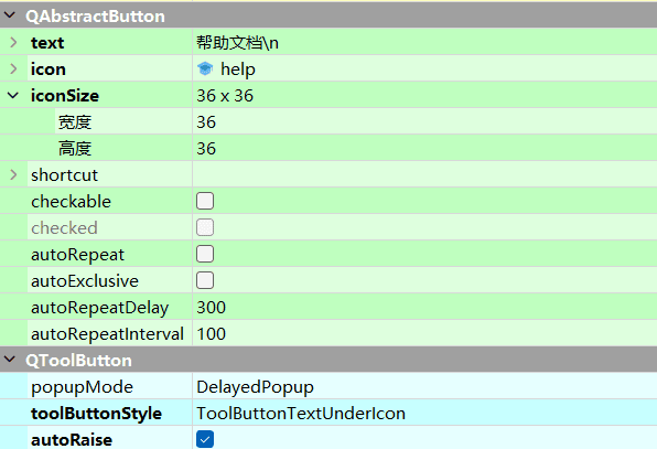 按钮设计 使用Qt Designer在UI中添加帮助文档按钮,找到prev_tools_teach,内部添加QToolButton组件,并设置layoutLeftMargin设置为4,其他 Margin 设置为0,Spacing 设置为2。按钮设置如下图。
