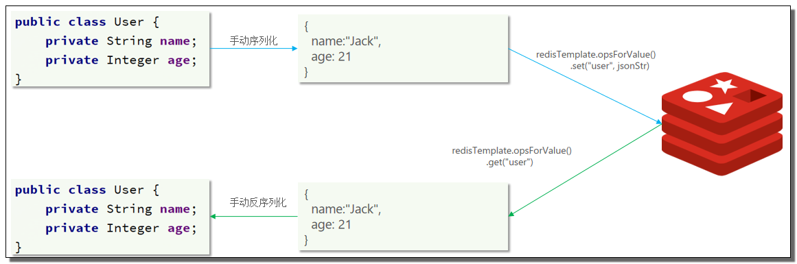 为了节省内存空间,直接使用String序列化器,只储存String类型的key和value。存储对象时,手动完成对象的序列化和反序列化