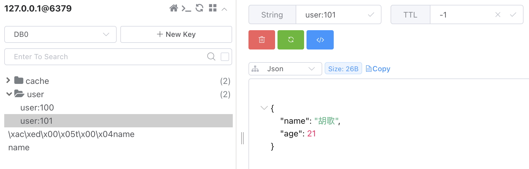 stringRedisTemplate.opsForValue().set("user:101",json);