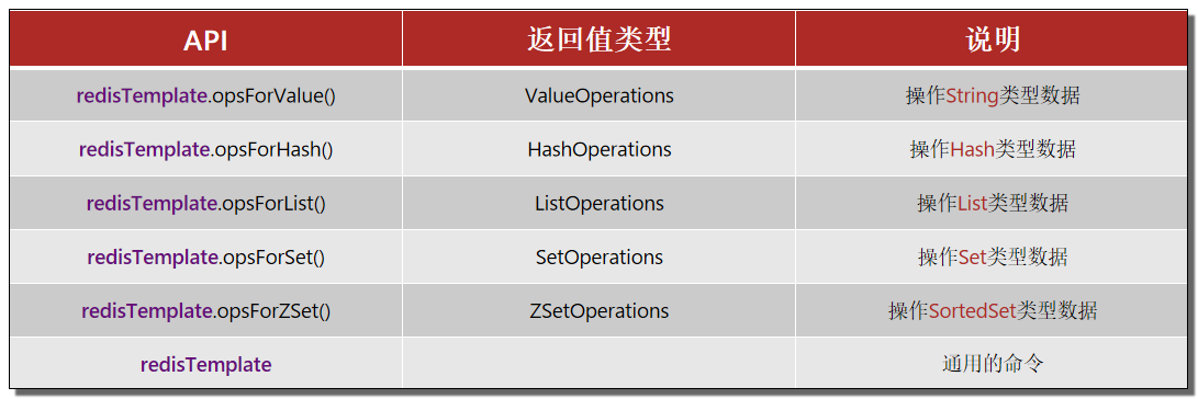 SpringDataRedis中提供了RedisTemplate工具类,其中封装了各种对Redis的操作。并且将不同数据类型的操作API封装到了不同的类型中: