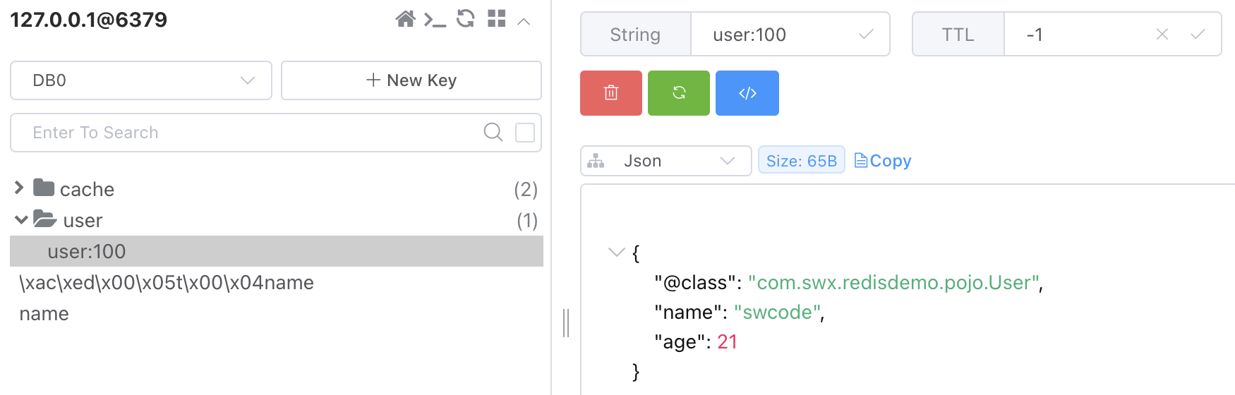redisTemplate.opsForValue().set("user:100", new User("swcode", 21));