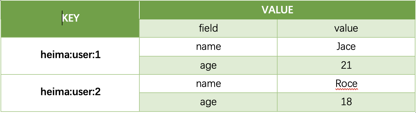 | heima:user:1 | {“id”:1, “name”: “Jack”, “age”: 21} |