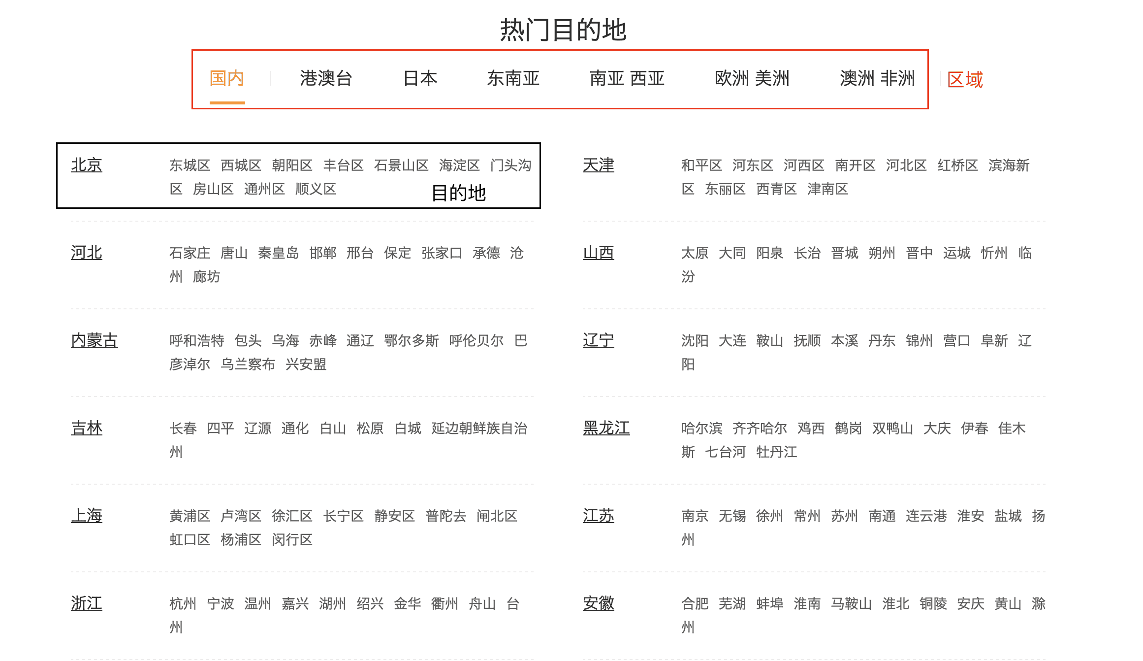 图中红色框为区域模块,国内属于默认展示,其他的使用区域表存储,其对应的目的地可以有多个