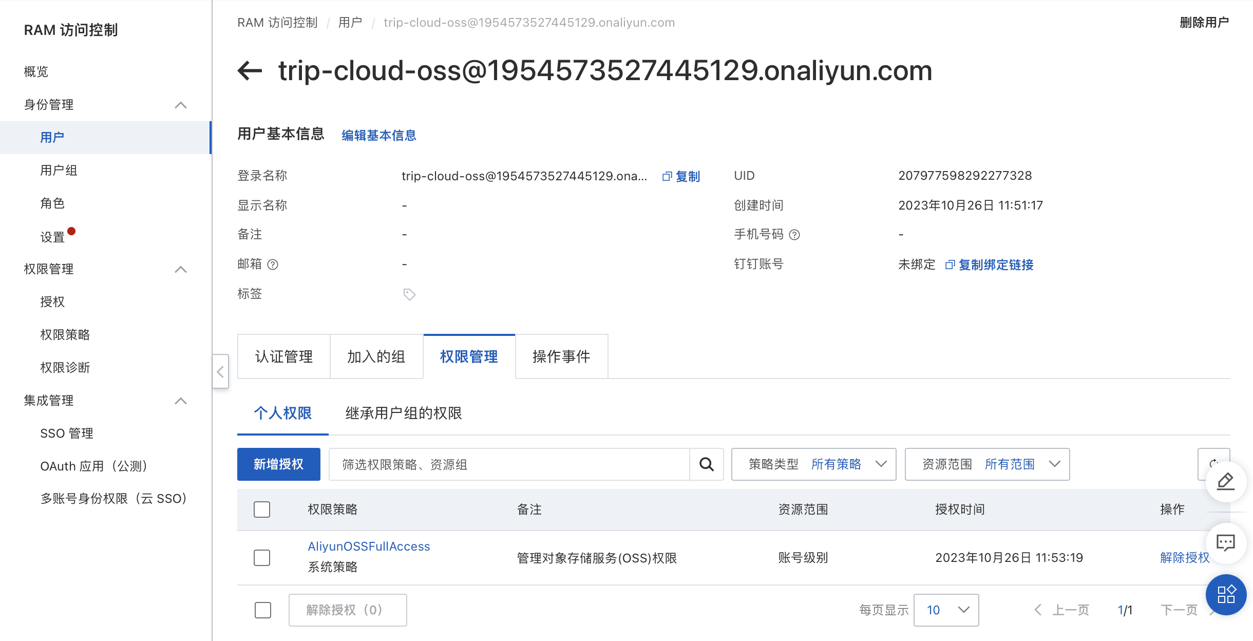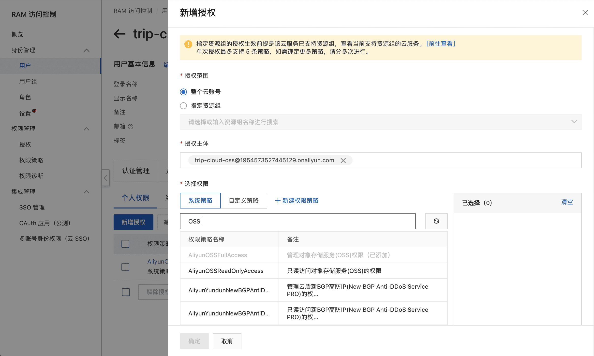 给整个云账号授权,权限搜索OSS,授予:AliyunOSSFullAccess,即所有OSS操作权限。