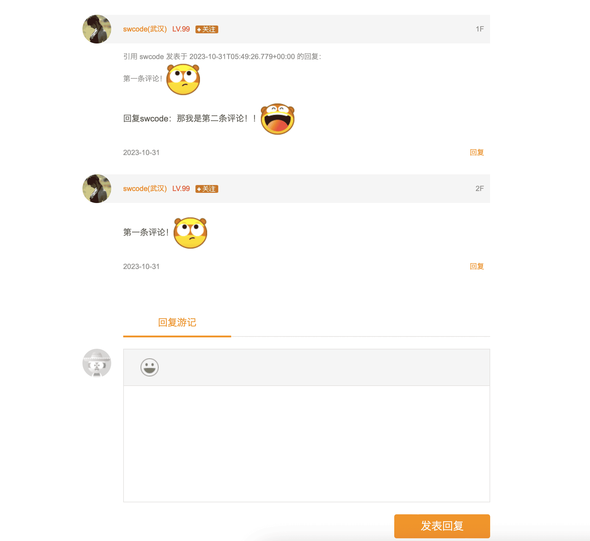 对应的前端页面如下,游记模块的评论即可对游记评论,也能回复其他评论。